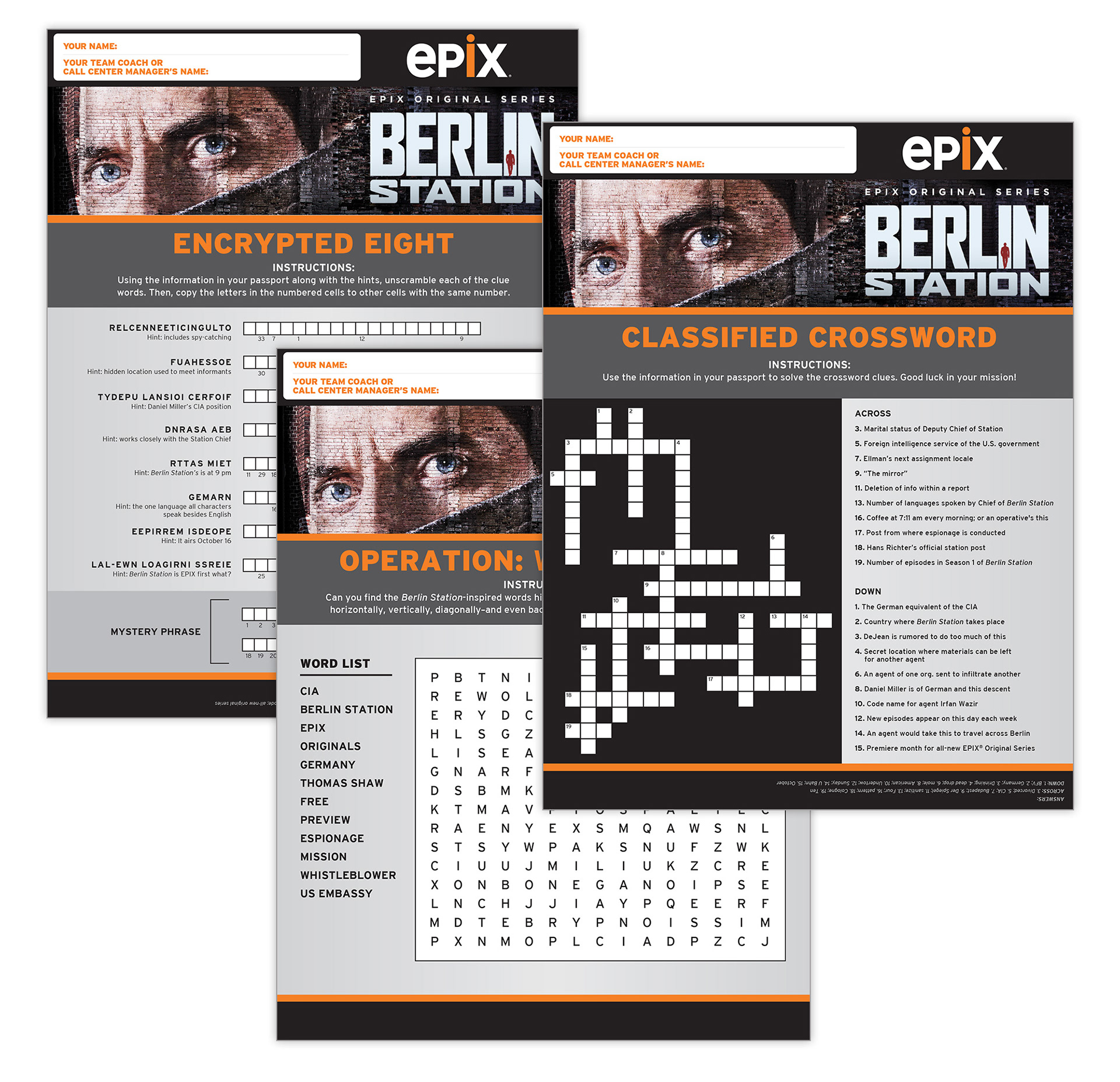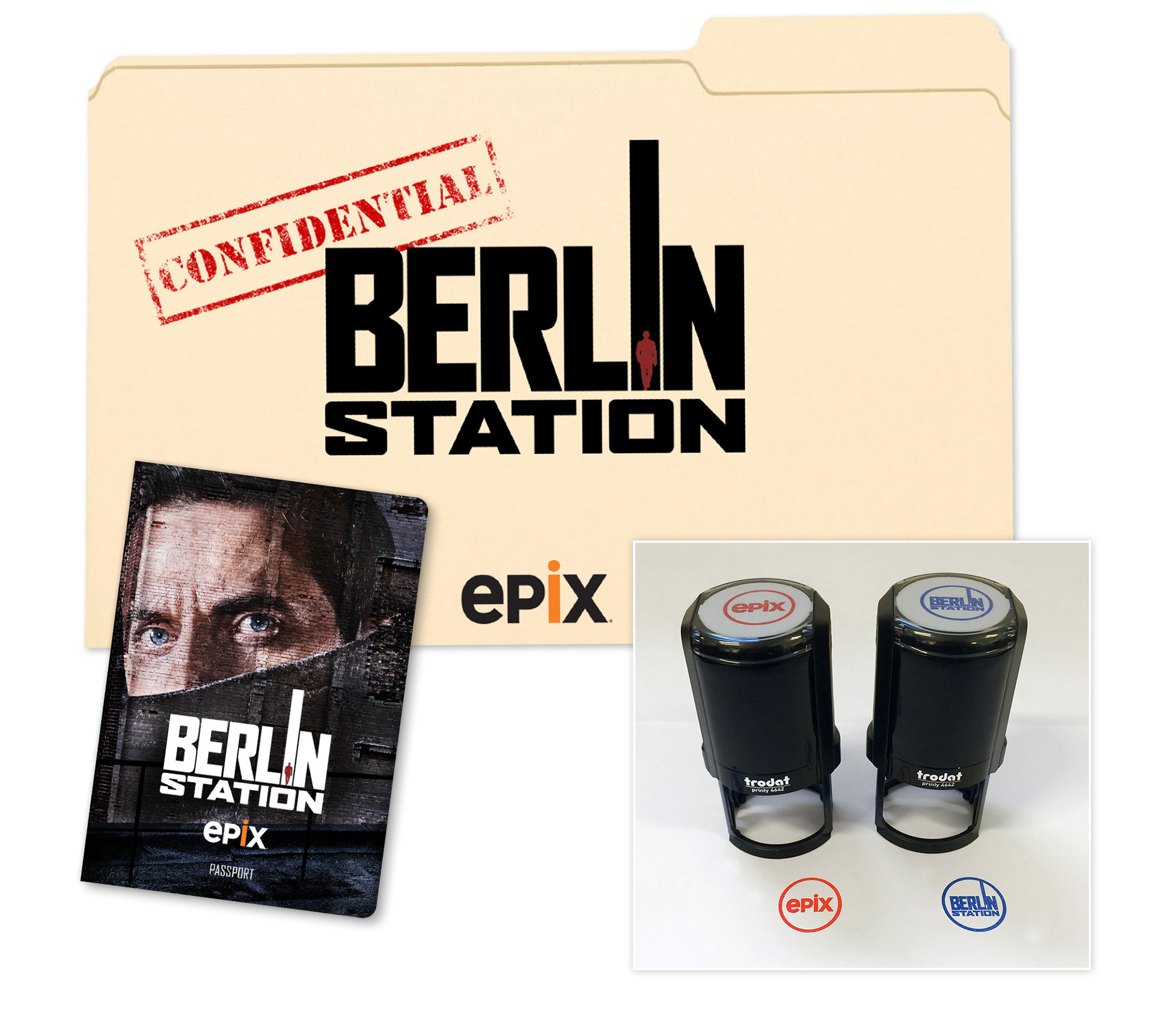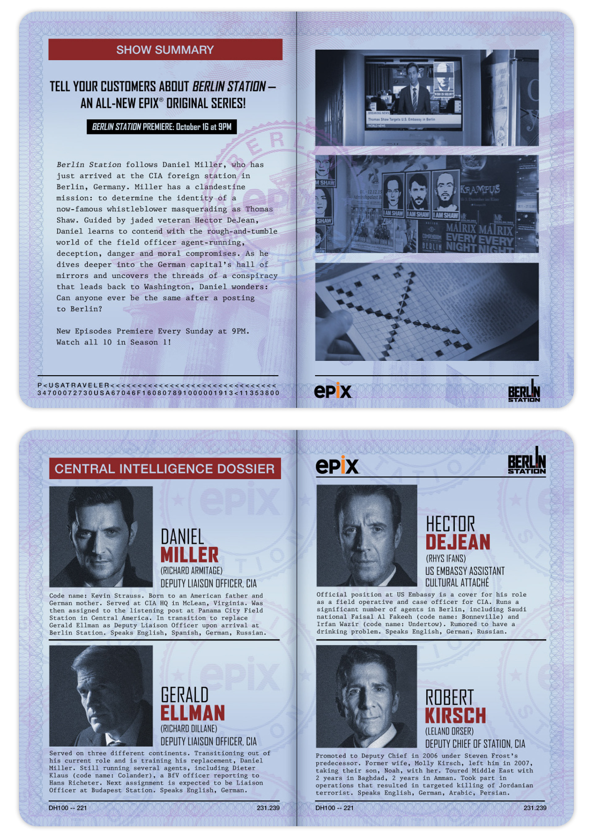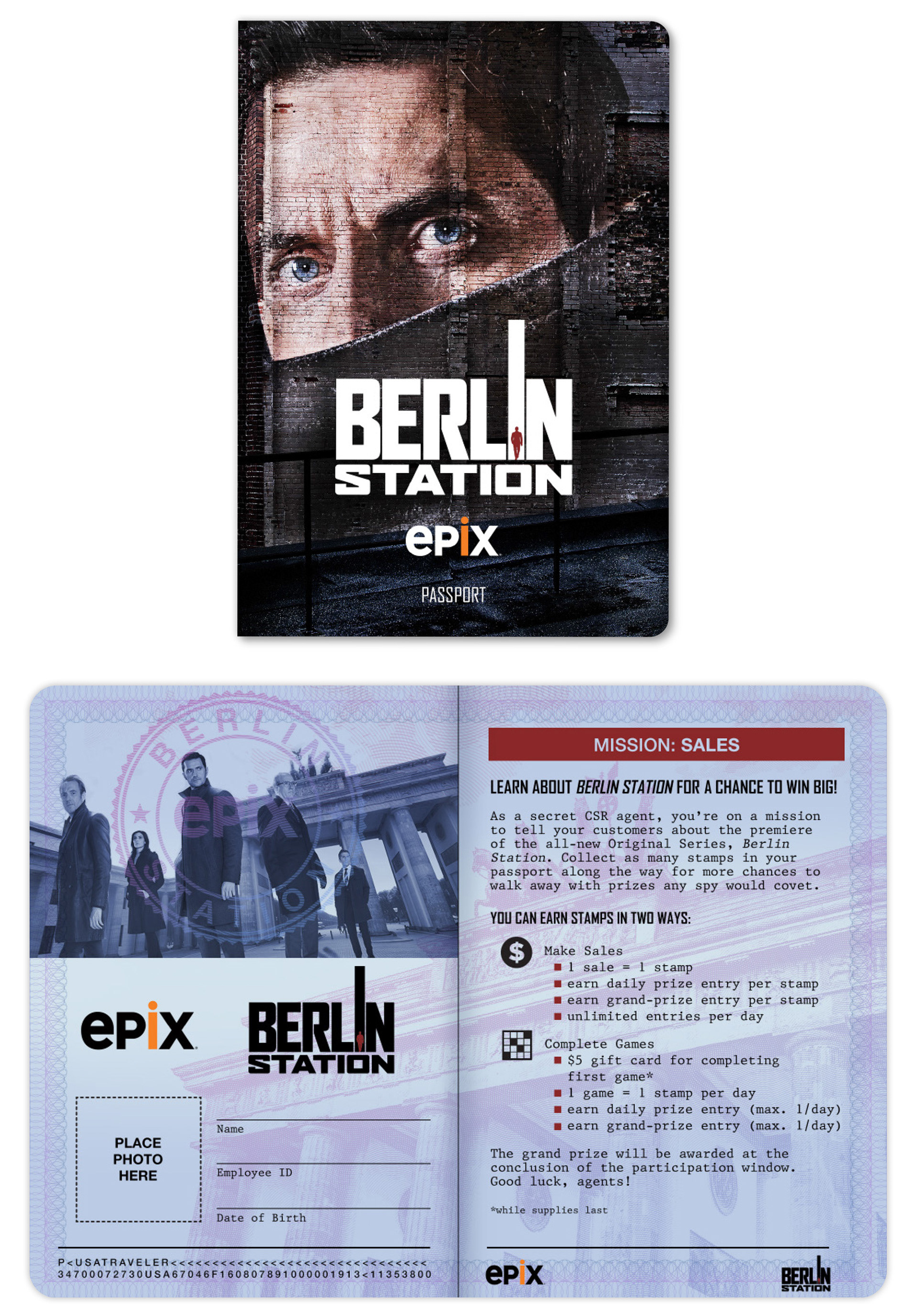 To teach customer service reps (CSR's) about the new EPIX original espionage series "Berlin Station", we developed a custom spy kit complete with a passport, stamps, and mission orders. The materials contain show info and puzzles that CSR's use to learn about the program. CSRs receive a stamp in their passport for sales and completion of puzzles. Each stamp earns them an entry for prizes at the conclusion to the promotion.
